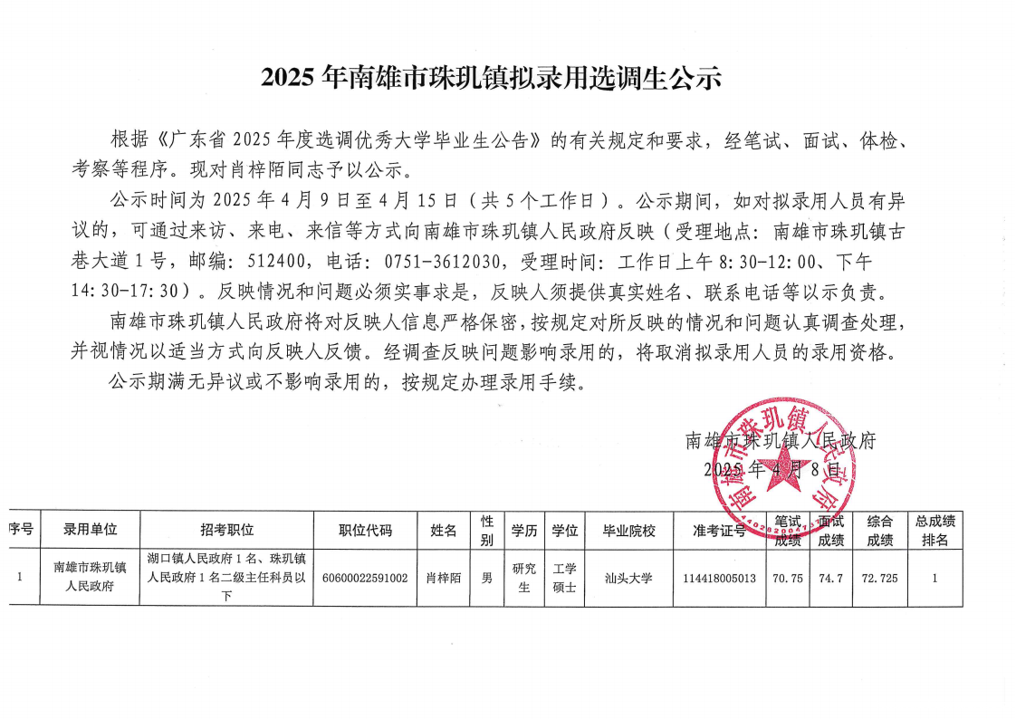 2025年huanyilianmeng.市珠玑镇拟录用选调生公示
